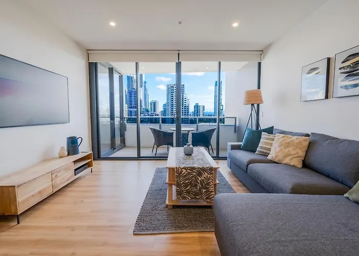 The spacious Stylish Apt With City Views - Gym, Pool, Sauna! Gold Coast is located 3.8 km from the Sea World and 5 minutes' stroll from Budds Beach. Offering access to an outdoor swimming pool, this apartment is not far from the Sling Shot & Vomatron Amusement Rides Gold Coast.